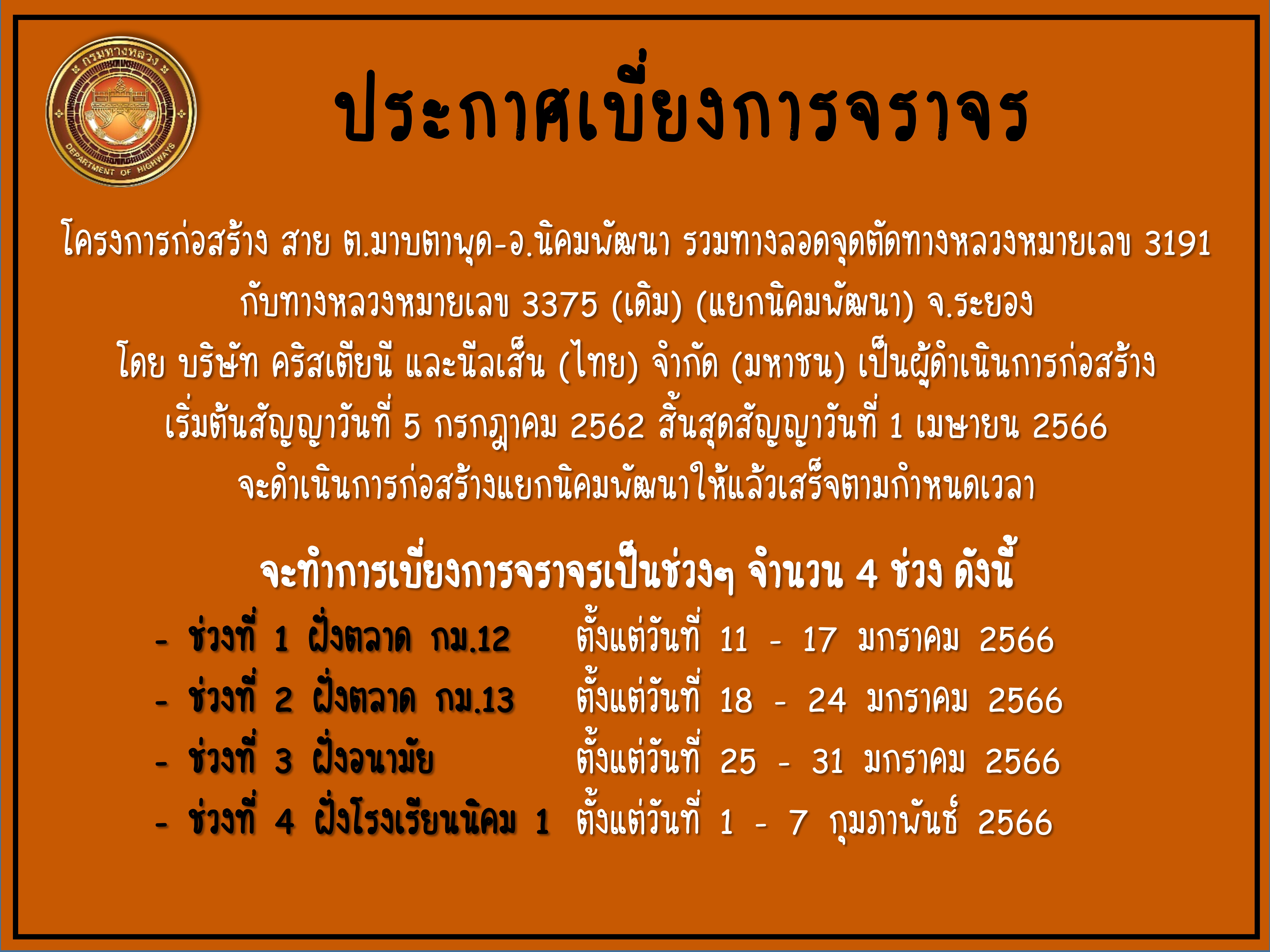 โครงการก่อสร้าง สาย ต.มาบตาพุด - อ.นิคมพัฒนา รวมทางลอดจุดตัดทางหลวงหมายเลข 3191 กับ ทางหลวงหมายเลข 3375 (เดิม) (แยกนิคมพัฒนา) จ.ระยอง โดยบริษัท คริสเตียนี และนีลเส็น (ไทย) จำกัด (มหาชน) เป็นผู้ดำเนินการก่อสร้าง เริ่มต้นสัญญาวันที่ 5 กรกฎาคม 2562 สิ้นสุดสัญญาวันที่ 1 เมษายน 2566 จะดำเนินการก่อสร้างแยกนิคมพัฒนาให้แล้วเสร็จตามกำหนดเวลา