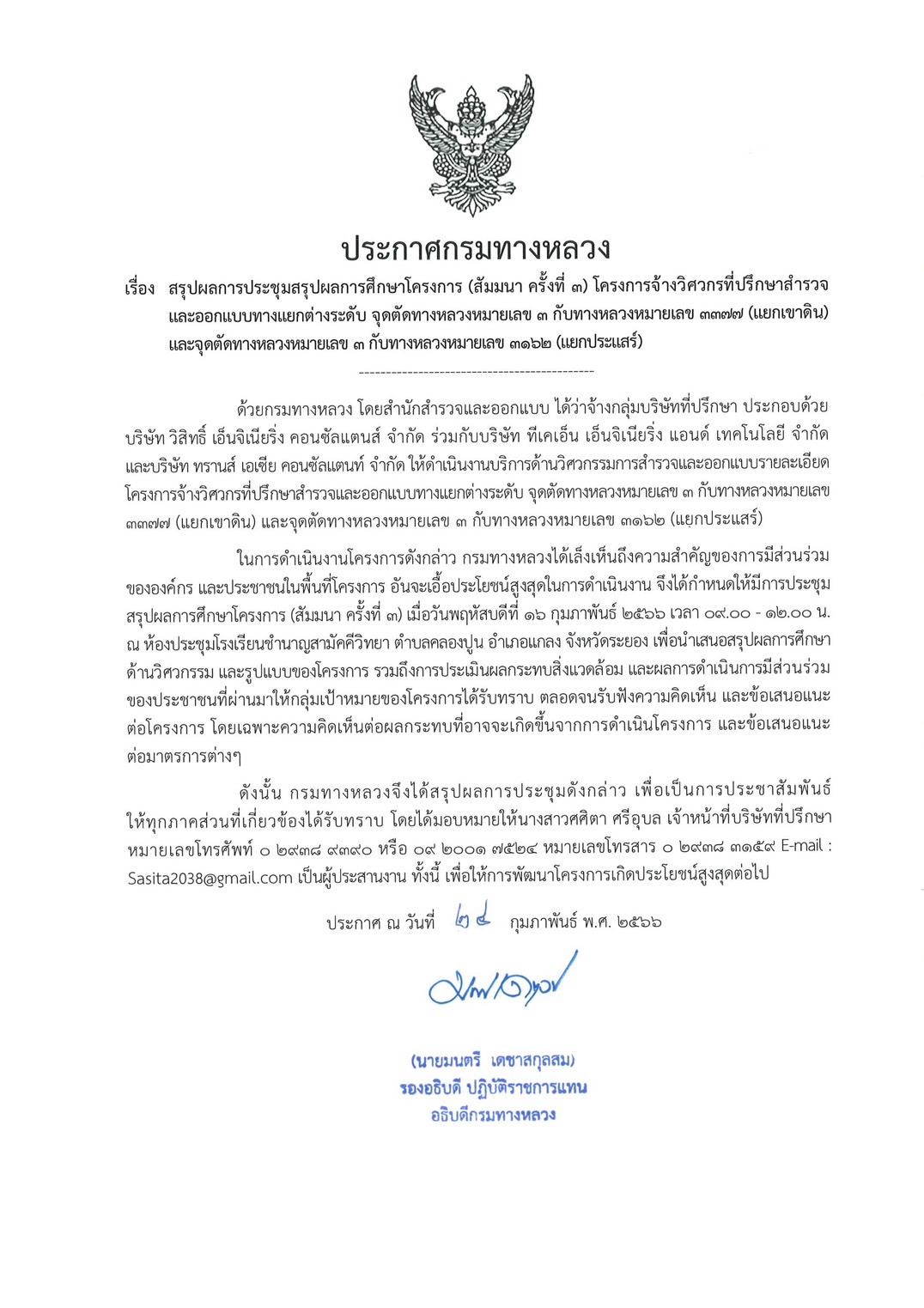 ประกาศกรมทางหลวง เรื่อง สรุปผลการประชุมสรุปผลการศึกษาโครงการ (สัมมนา ครั้งที่ 3) โครงการจ้างวิศวกรที่ปรึกษาสำรวจและออกแบบทางแยกต่างระดับ จุดตัดทางหลวงหมายเลข 3 กับทางหลวงหมายเลข 3377 (แยกเขาดิน) และจุดตัดทางหลวงหมายเลข 3 กับทางหลวงหมายเลข 3162 (แยกประแสร์)