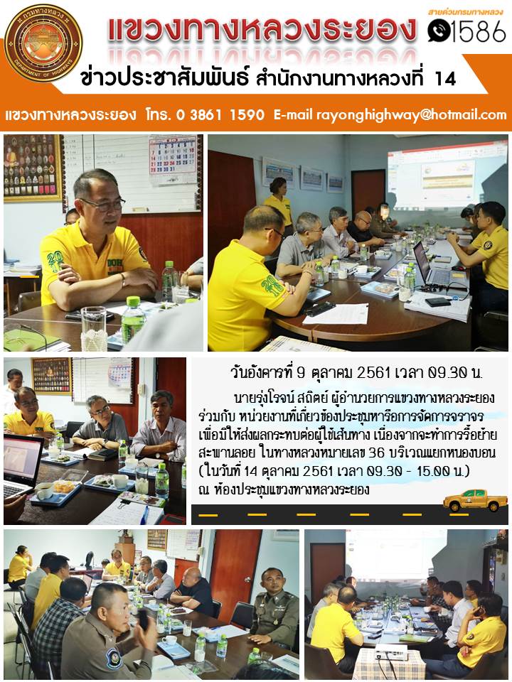 วันอังคารที่ 9 ตุลาคม 2561 เวลา 09.30 น. นายรุ่งโรจน์ สถิตย์ ผู้อำนวยการแขวงทางหลวงระยอง ร่วมกับ หน่วยงานที่เกี่ยวข้องประชุมหารือการจัดการจราจร เพื่อมิให้ส่งผลกระทบต่อผู้ใช้เส้นทาง เนื่องจากจะทำการรื้อย้ายสะพานลอย ในทางหลวงหมายเลข 36 บริเวณแยกหนองบอน (ในวันที่ 14 ตุลาคม 2561 เวลา 09.30 - 15.00 น.) ณ ห้องประชุมแขวงทางหลวงระยอง #แขวงทางหลวงระยอง #กรมทางหลวง #สายด่วนกรมทางหลวง1586 #เรารักกรมทางหลวง