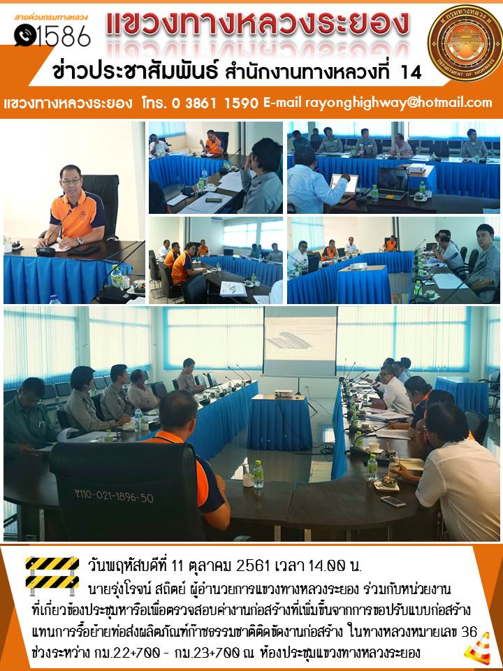 วันพฤหัสบดีที่ 11 ตุลาคม 2561 เวลา 14.00 น. นายรุ่งโรจน์ สถิตย์ ผู้อำนวยการแขวงทางหลวงระยอง ร่วมกับ หน่วยงานที่เกี่ยวข้องประชุมหารือเพื่อตรวจสอบค่างานก่อสร้างที่เพิ่มขึ้นจากการขอปรับแบบก่อสร้างแทนการรื้อย้ายท่อส่งผลิตภัณฑ์ก๊าซธรรมชาติติดขัดงานก่อสร้าง ในทางหลวงหมายเลข 36 ช่วงระหว่าง กม.22+700 - กม.23+700 ณ ห้องประชุมแขวงทางหลวงระยอง #แขวงทางหลวงระยอง #กรมทางหลวง #สายด่วนกรมทางหลวง1586 #เรารักกรมทางหลวง