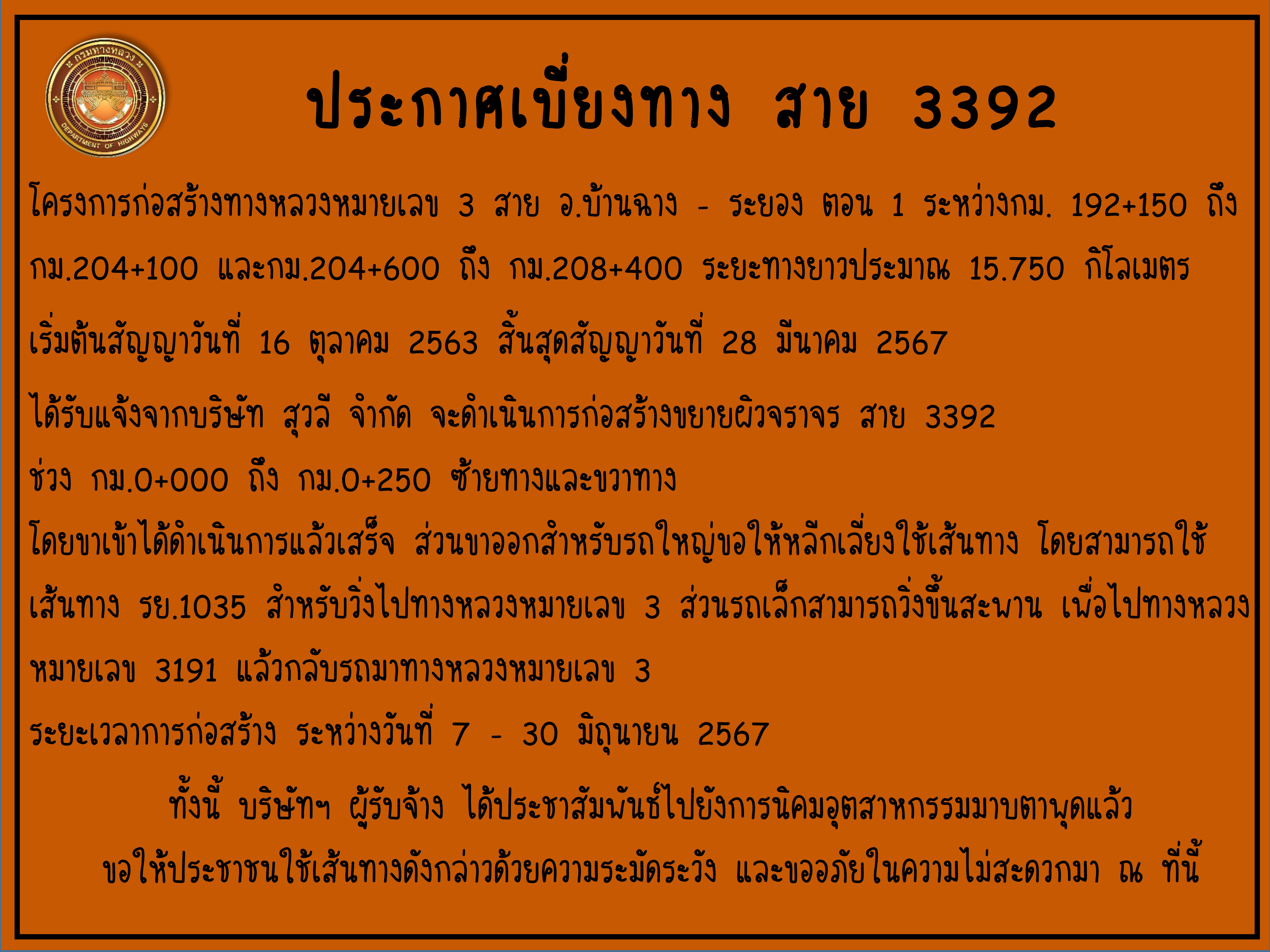 ข้อมูลข่าว : แจ้งเบี่ยงทาง สาย 3392 ตั้งแต่วันที่ 7 - 30 มิถุนายน 2567