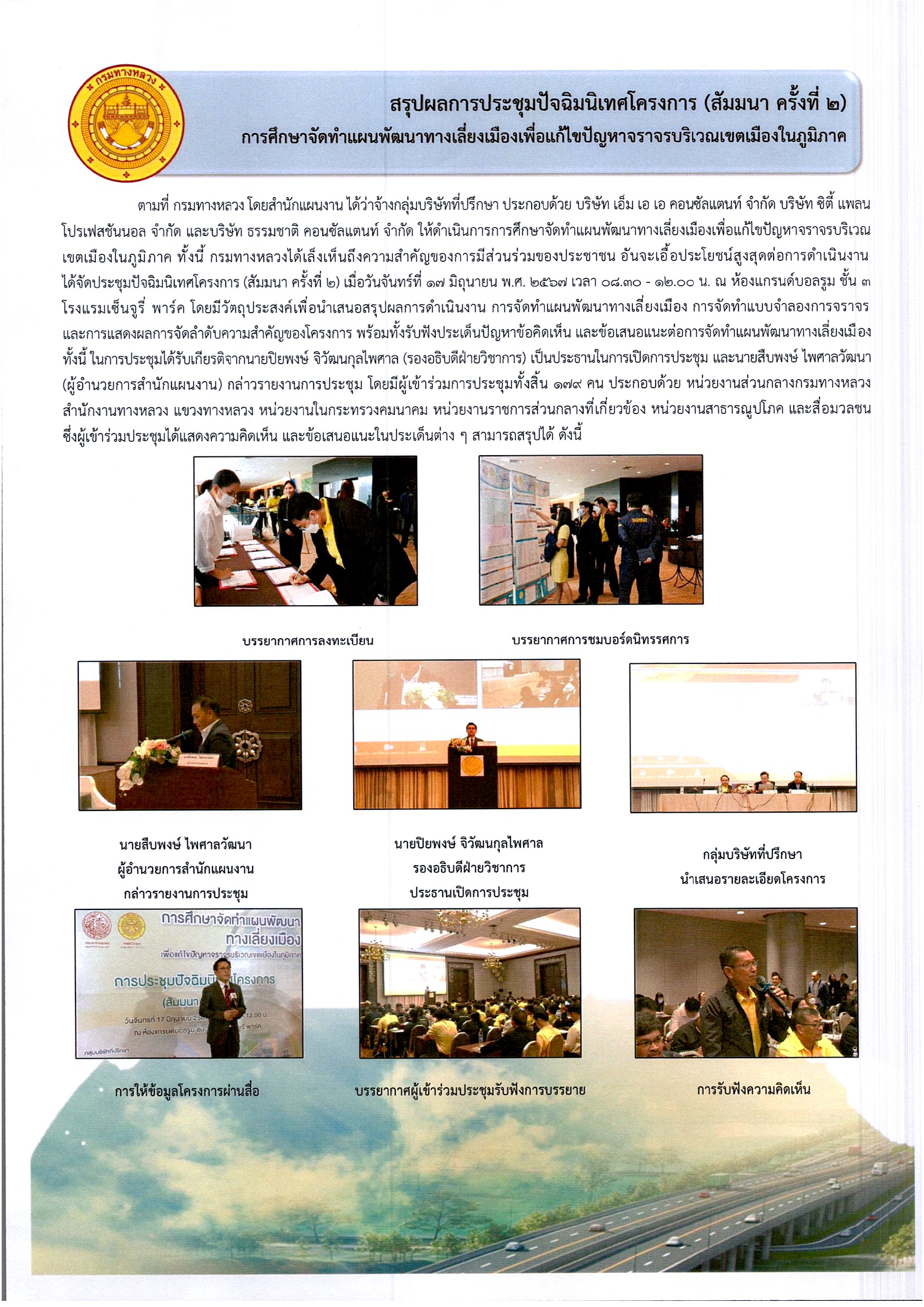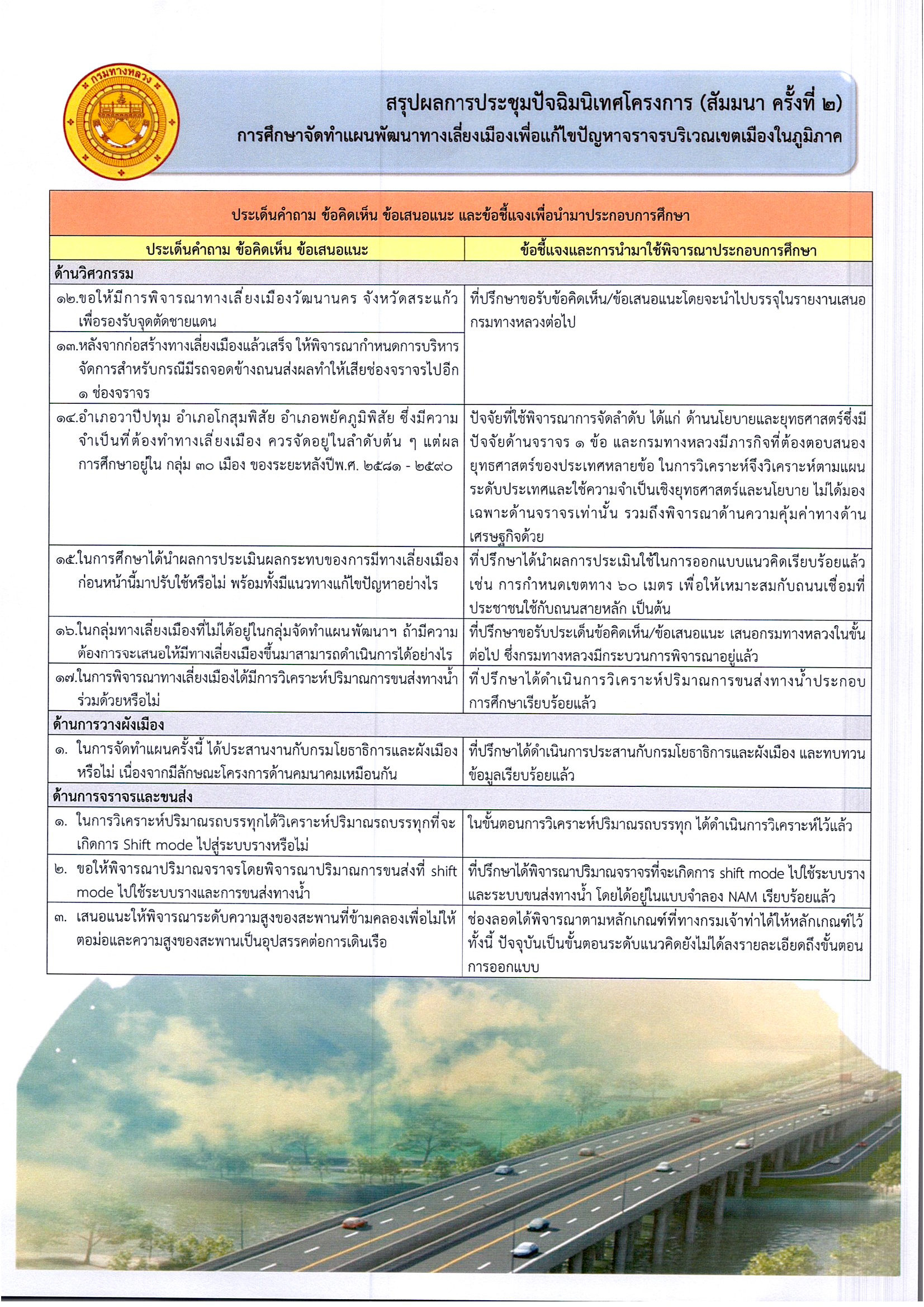ข้อมูลข่าว : สรุปผลการประชุมปัจฉิมนิเทศโครงการ (สัมมนา ครั้งที่ 2) การศึกษาจัดทำแผนพัฒนาทางเลี่ยงเมืองเพื่อแก้ไขปัญหาจราจรบริเวณเขตเมืองในภูมิภาค