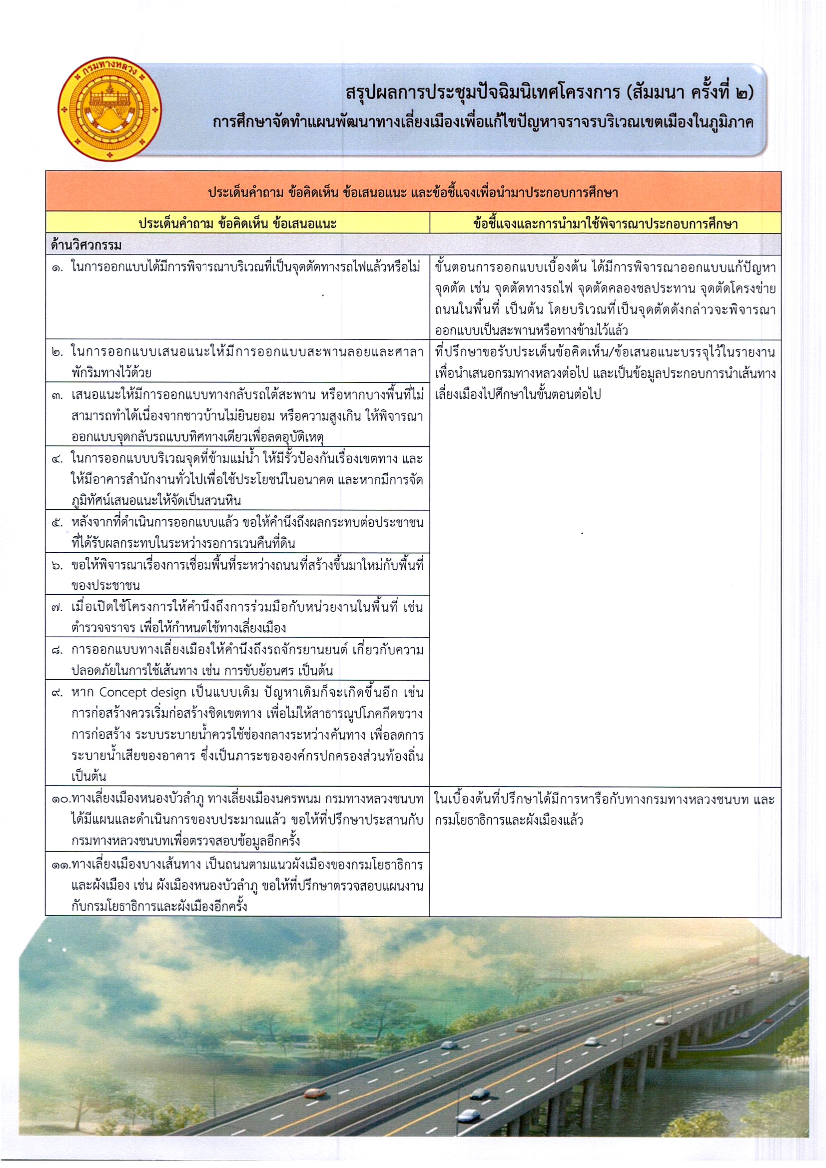 สรุปผลการประชุมปัจฉิมนิเทศโครงการ (สัมมนา ครั้งที่ 2) การศึกษาจัดทำแผนพัฒนาทางเลี่ยงเมืองเพื่อแก้ไขปัญหาจราจรบริเวณเขตเมืองในภูมิภาค