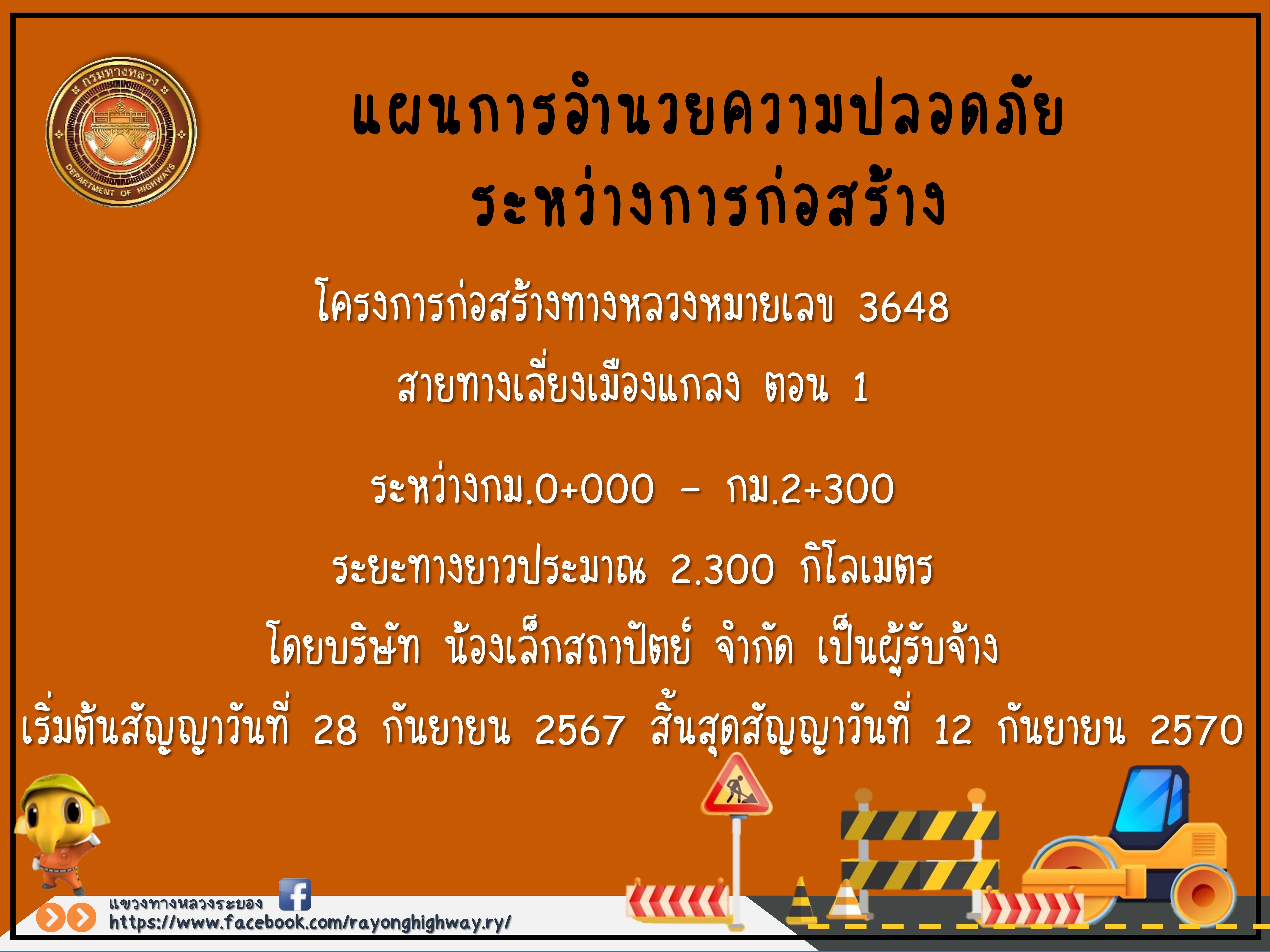 ข้อมูลข่าว : โครงการก่อสร้างทางหลวงหมายเลข 3648 สายทางเลี่ยงเมืองแกลง ตอน 1 ระหว่าง กม.0+000.000-กม.2+300.000 ระยะทางยาวประมาณ 2.300 กิโลเมตร รวมงานติดตั้งไฟฟ้าแสงสว่างและไฟกระพริบบนทางหลวง เริ่มต้นสัญญาวันที่ 28 กันยายน 2567 สิ้นสุดสัญญา วันที่ 12 กันยายน 2570