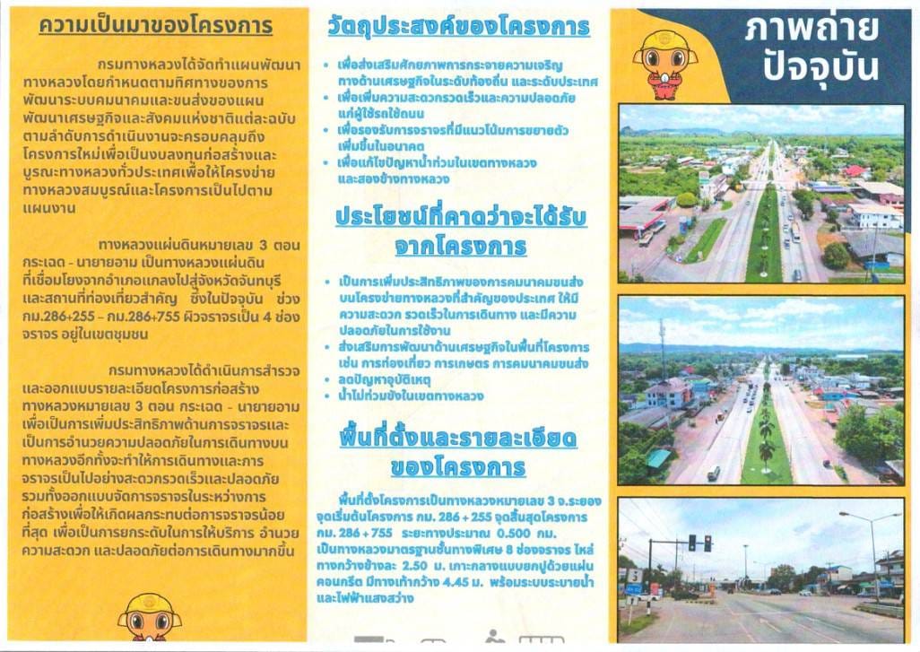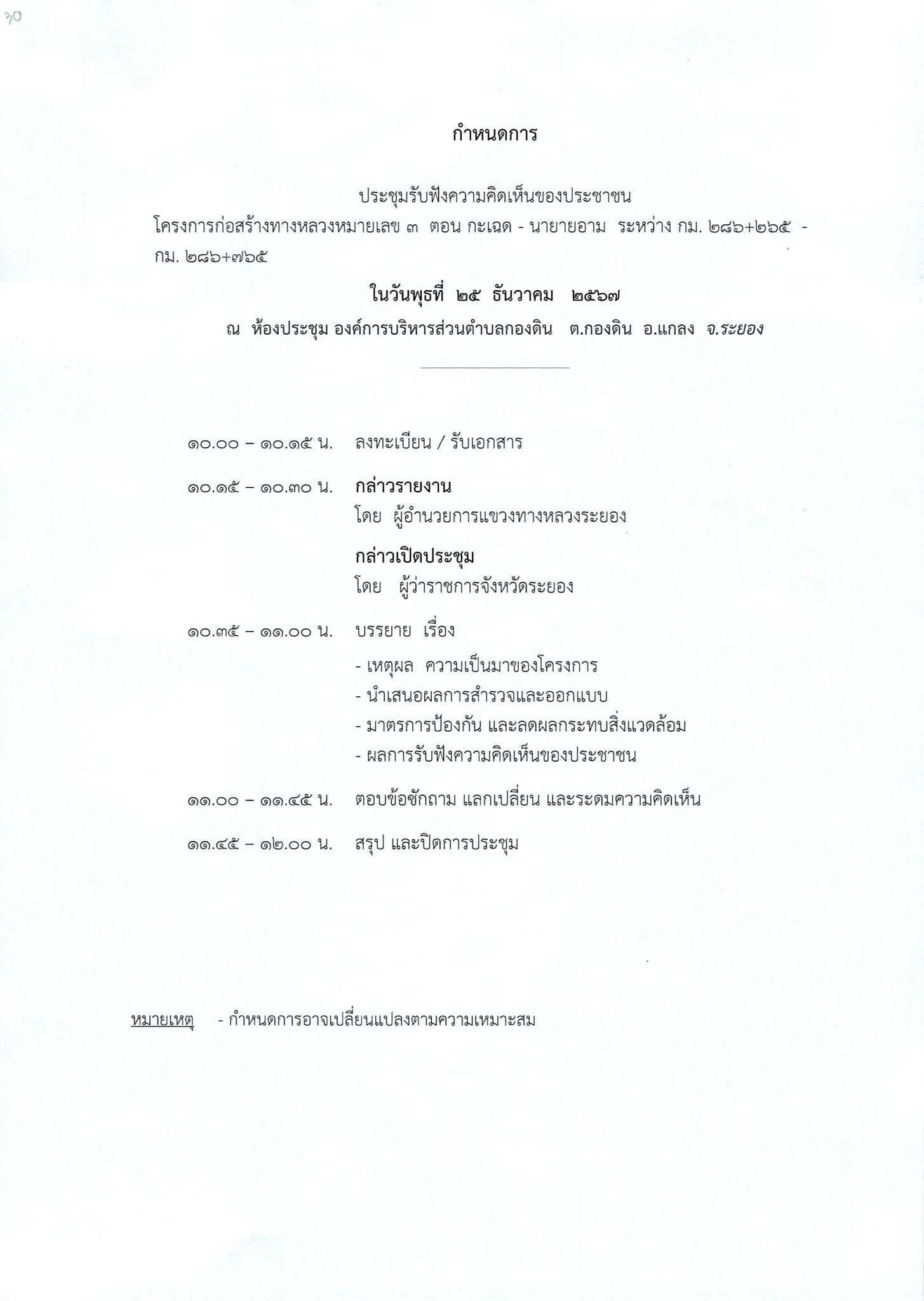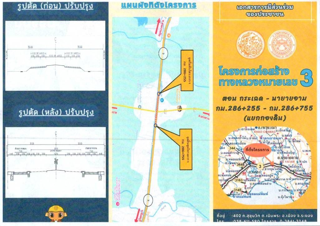 | ประกาศเรื่อง การประชุมการมีส่วนร่วมของประชาชน โครงการก่อสร้างทางหลวงหมายเลข 3 ตอน กระเฉด - นายายอาม ระหว่าง กม.286+265 - กม.286+765 แขวงทางหลวงระยองขอเชิญผู้ที่สนใจเข้าร่วมประชุมแสดงความคิดเห็นและข้อเสนอแนะต่อโครงการฯ ในวันพุธที่ 25 ธันวาคม 2567 เวลา 10.00-12.00 น. ณ ห้องประชุมองค์การบริหารส่วนตำบลกองดิน ตำบลกองดิน อำเภอแกลง จังหวัดระยอง | 239 | ดาวน์โหลด |