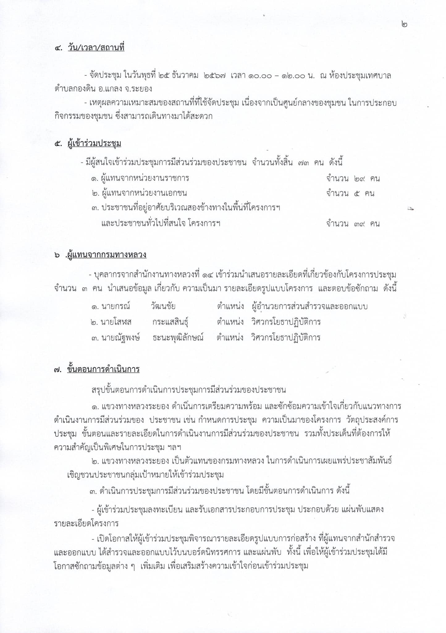 รายงานสรุปผลการดำเนินงานการมีส่วนร่วมของประชาชน โครงการก่อสร้างทางหลวงหมายเลข 3 ตอน กระเฉด-นายายอาม ระหว่าง กม.286+265-กม.286+765 ระยะทางประมาณ 0.500 กิโลเมตร