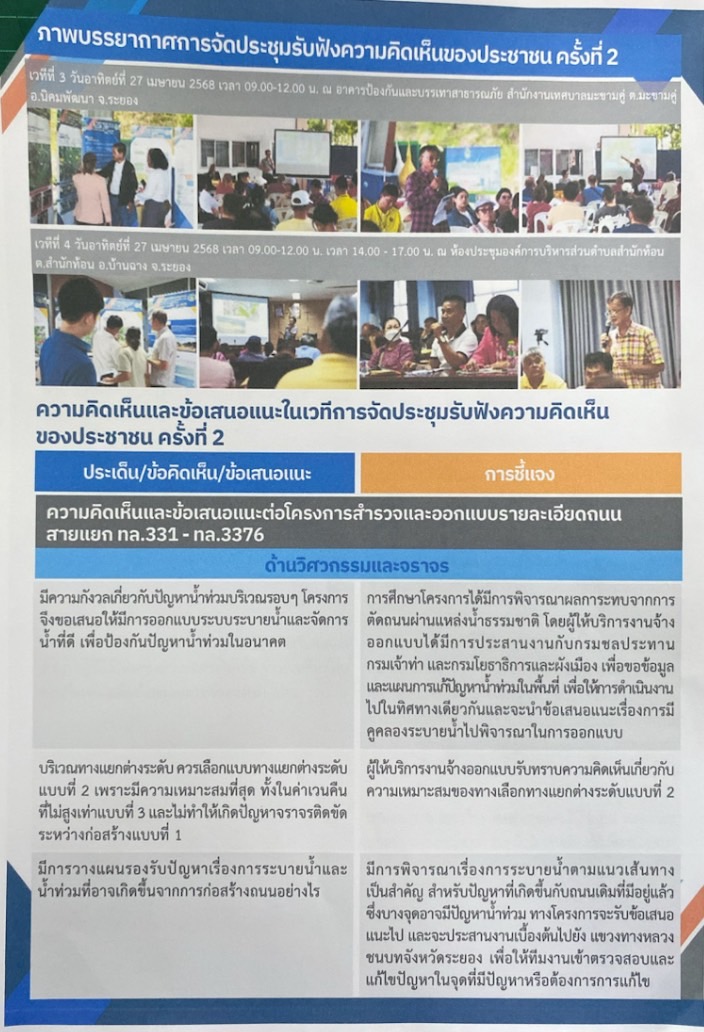 สายแยก ทล.331 - ทล.3376 จังหวัดชลบุรี,ระยอง โดยการดำเนินงานของโครงการ กรมทางหลวงชนบท ได้กำหนดให้มีการประชุมรับฟังความคิดเห็นและการมีส่วนร่วมของประชาชน ครั้งที่ 2