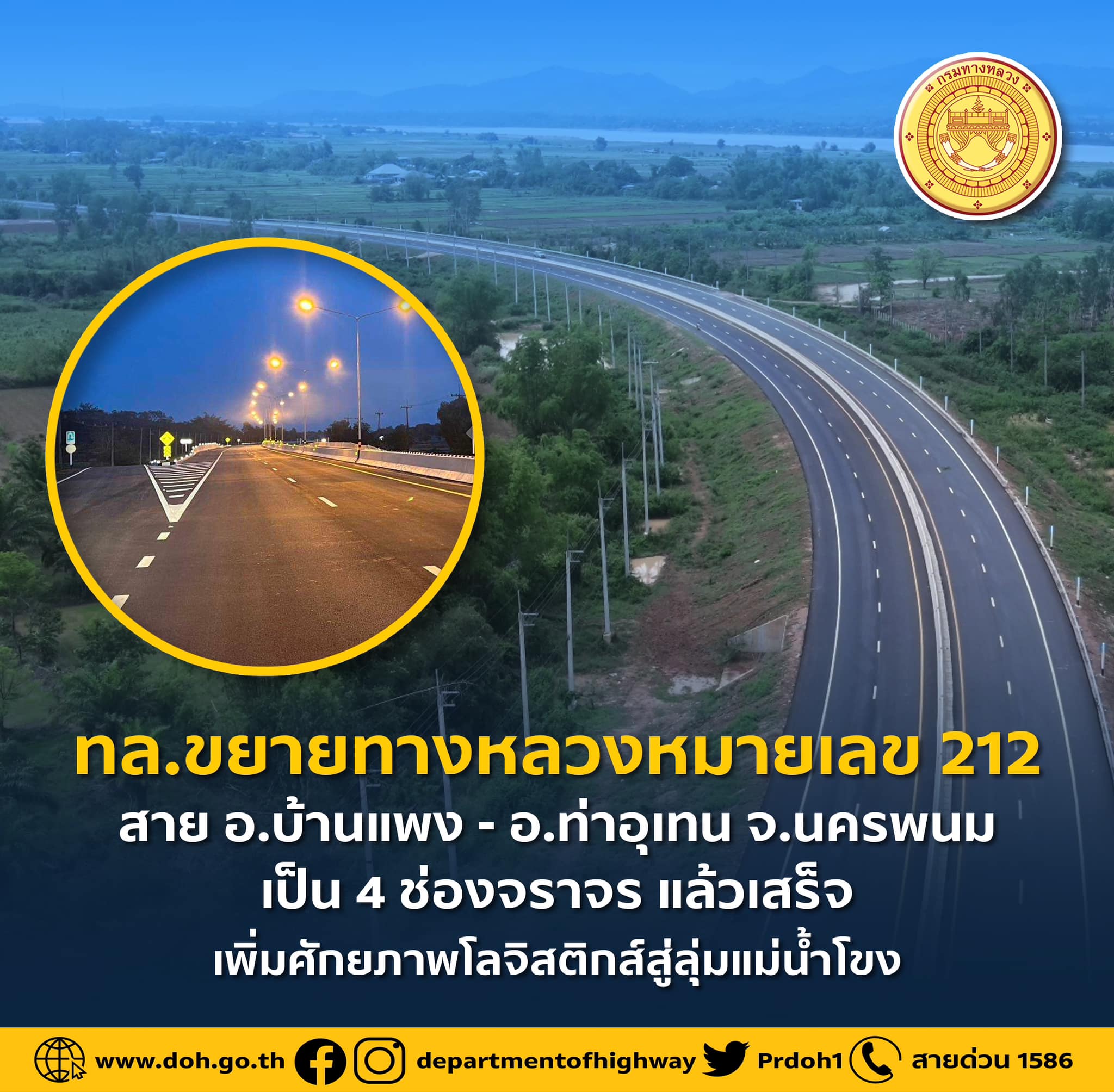 กรมทางหลวง โดยสำนักก่อสร้างทางที่ 2 ได้ดำเนินโครงการปรับปรุงทางหลวงหมายเลข 212 สาย อ.บ้านแพง อ.ท่าอุเทน ตอน อ.บ้านแพง - บ.โนนสมบูรณ์ ตอน 1 ระหว่าง กม.222+743 - กม.237+000 ระยะทางประมาณ 14.257 กิโลเมตร แล้วเสร็จ เพื่อพัฒนาการคมนาคมภาคตะวันออกเฉียงเหนือสู่ลุ่มแม่น้ำโขง