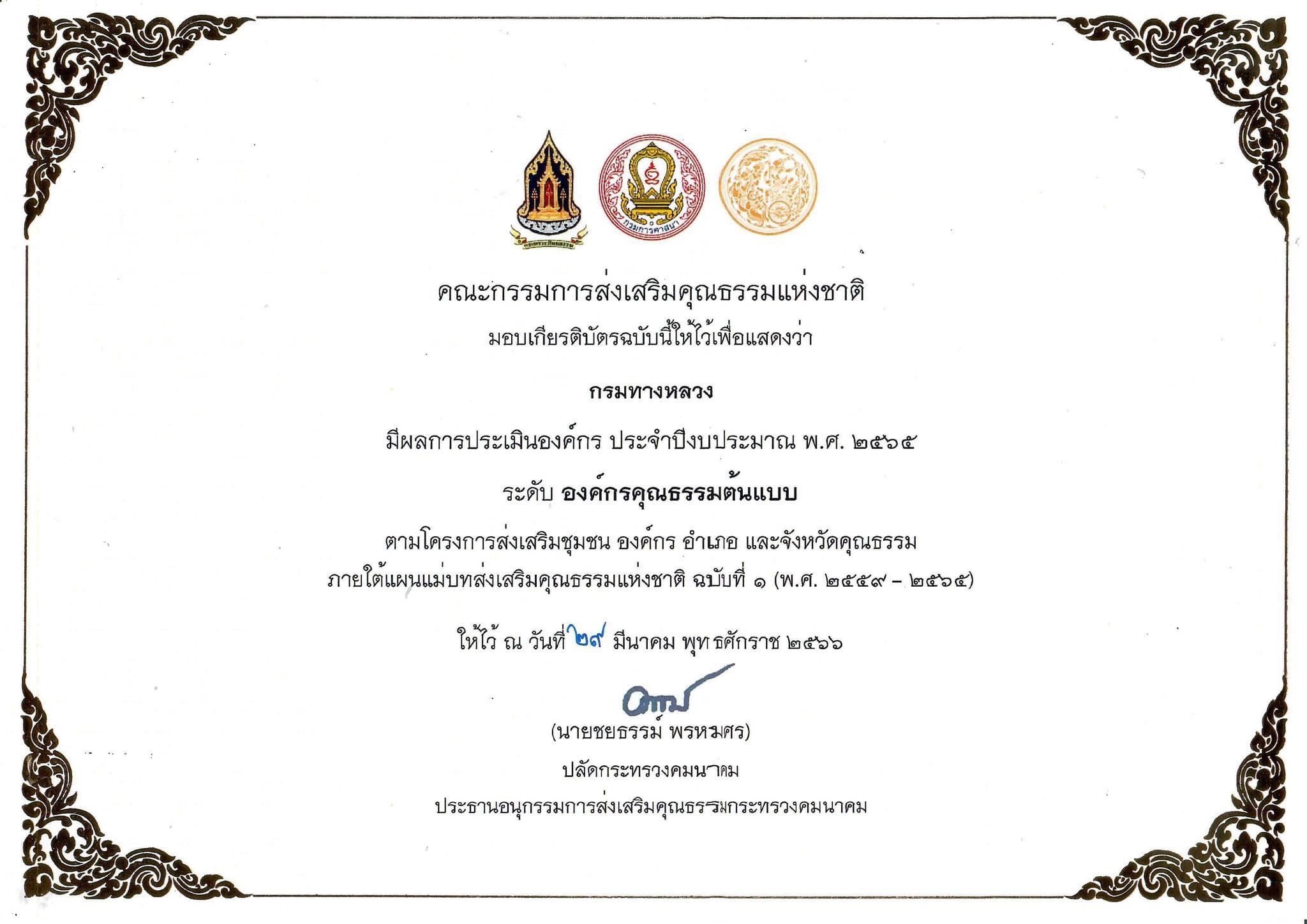 114 07/06/2566 กรมทางหลวงได้รับการประเมินองค์กรคุณธรรม ประจำปีงบประมาณ 2565 ในระดับ “คุณธรรมต้นแบบ”