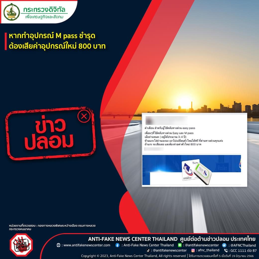 113 19/06/2566 [ข่าวปลอม] ทำอุปกรณ์ M-pass ชำรุด เสียหาย ต้องเสียค่าอุปกรณ์ใหม่ 800 บาท