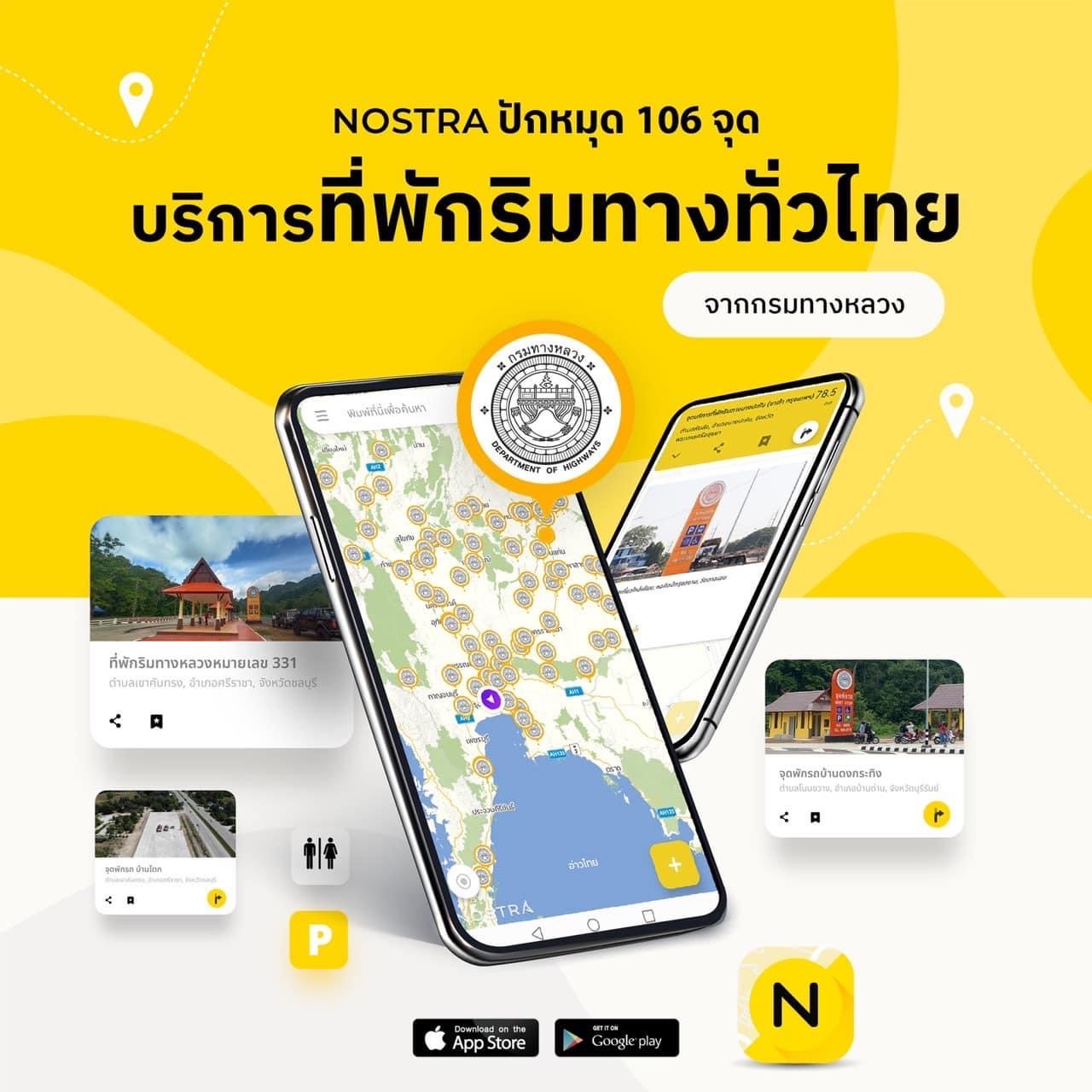 กรมทางหลวง ชี้พิกัดที่พักริมทางทั่วไทย 106 แห่ง ผ่านแอปพลิเคชัน “NOSTRA” เพื่ออำนวยความสะดวกและเพิ่มความปลอดภัยในการเดินทางให้แก่ผู้ใช้ทาง