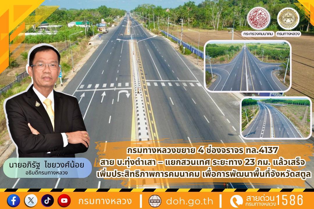 กรมทางหลวงขยาย 4 ช่องจราจร ทล.4137 สายบ.ทุ่งตำเสา – แยกสวนเทศ ระยะทาง 23 กม. แล้วเสร็จ เพิ่มประสิทธิภาพการคมนาคม เพื่อการพัฒนาพื้นที่จังหวัดสตูล