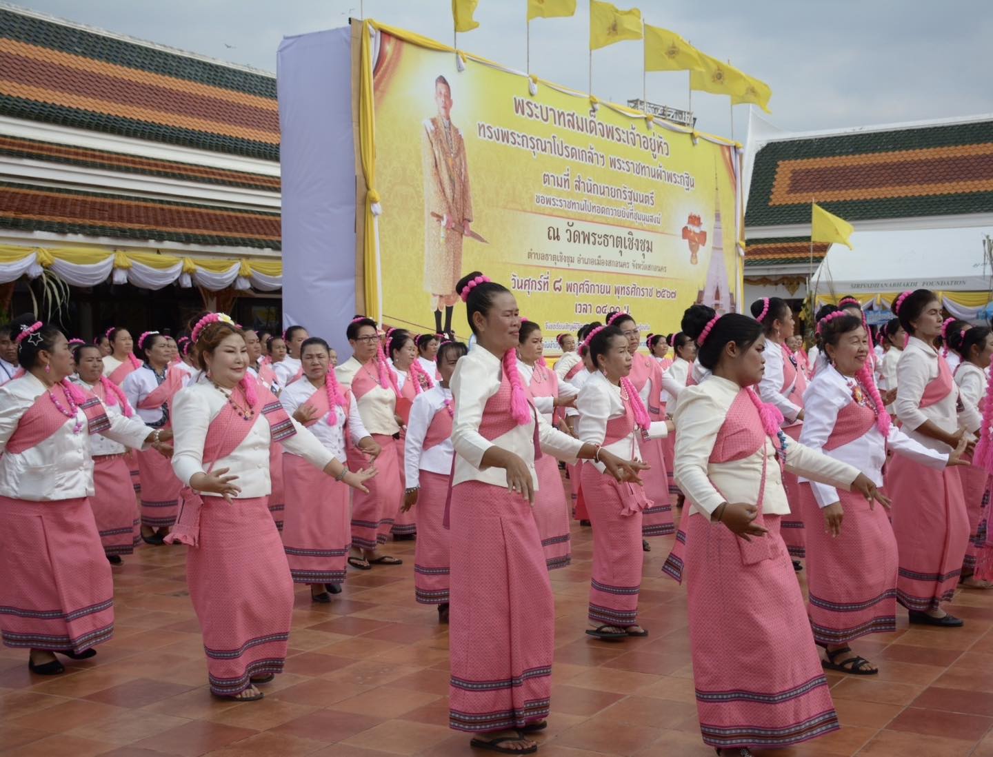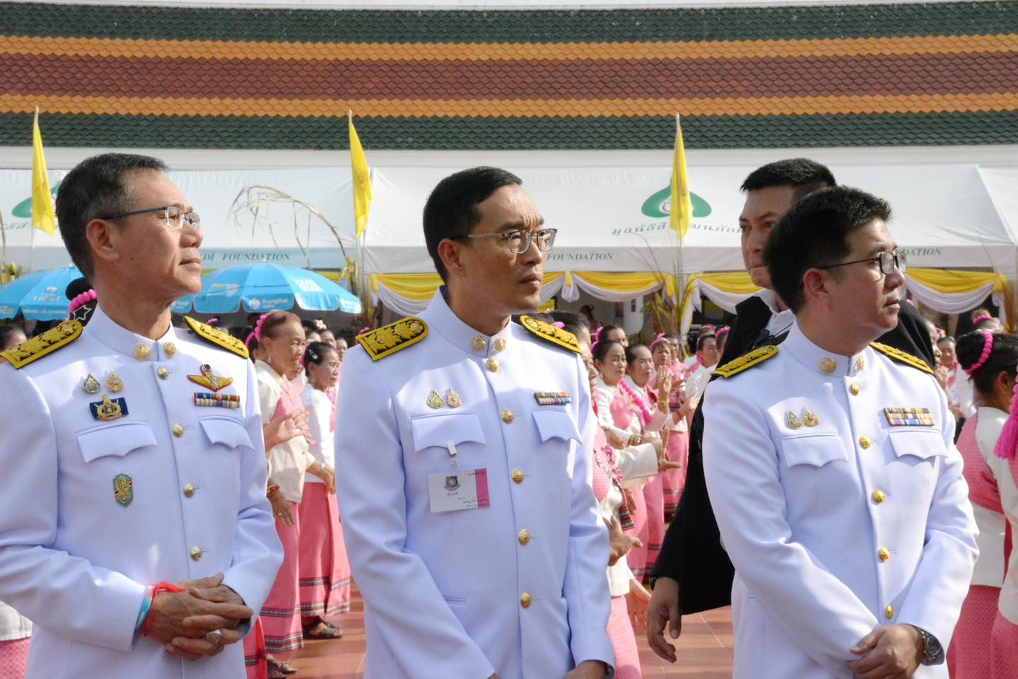 การนี้กลุ่มแม่บ้านกว่า 1,000 คน จาก 18 อำเภอ จังหวัดสกลนคร ใส่ชุดภูไทยสีชมพูลายราชวัตรรำเพลงงามสกลละเบ๋อ เพลงชวนเที่ยวสกล ให้การต้อนรับนายกรัฐมนตรีและคณะ