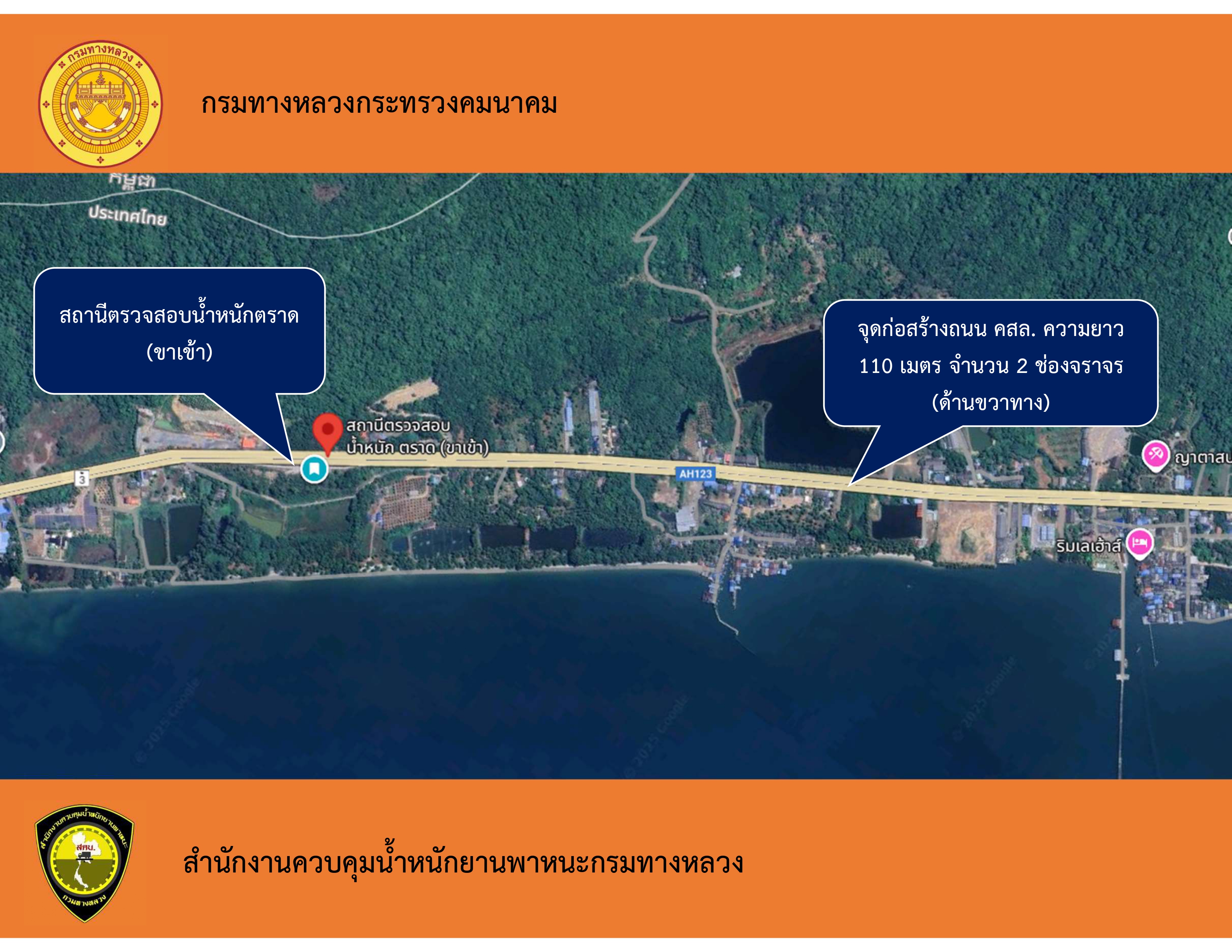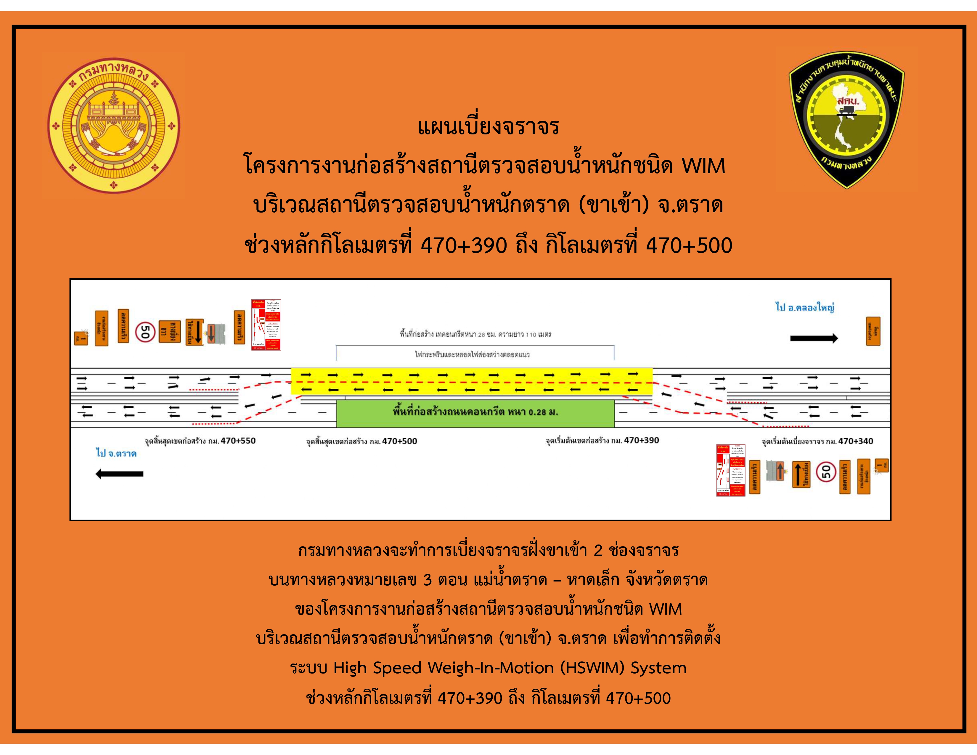 เนื่องจากมีการก่อสร้างสถานีตรวจสอบน้ำหนักชนิด WIM บริเวณสถานีตรวจสอบน้ำหนักตราด (ขาเข้า) ผู้รับจ้างจะขอเบี่ยงและปิดช่องทางจราจรบางส่วนเพื่อดำเนินงานก่อสร้าง เพื่อเป็นการบรรเทาปัญหาจราจรติดขัดและปัญหาอื่นๆ ที่เกี่ยวข้อง จึงขอความอนุเคราะห์ประชาสัมพันธ์ให้ประชาชนผู้ใช้เส้นทางเเละผู้ที่เกี่ยวข้องได้ทราบเพื่อหลีกเลี่ยงการใช้เส้นทางดังกล่าว