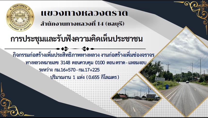 แขวงทางหลวงตราด จึงขอเรียนเชิญผู้ที่เกี่ยวข้องหรือผู้ที่สนใจ เข้ารับฟังและร่วมประชุมแสดงความคิดเห็นและข้อเสนอแนะต่อโครงการฯ เพื่อพัฒนาโครงการให้เกิดประโยชน์สูงสุดต่อไป