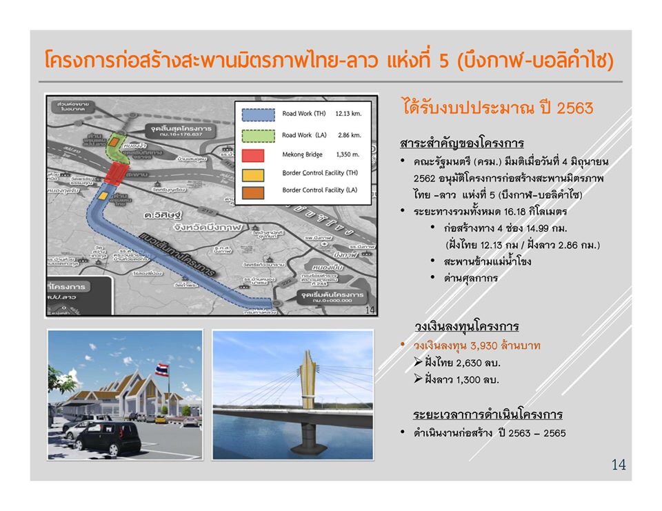 1.สะพานมิตรภาพระหว่างไทย - ประเทศเพื่อนบ้าน ซึ่งตามแผนทั้งหมดมี 15 แห่ง เปิดให้บริการแล้ว 10 แห่ง อยู่ระหว่างการก่อสร้าง 1 แห่ง มีแผนจะก่อสร้าง 4 แห่ง โดยล่าสุด คณะรัฐมนตรี (ครม.) มีมติเมื่อวันที่ 4 มิถุนายน 2562 อนุมัติโครงการก่อสร้างสะพานมิตรภาพไทย - ลาว แห่งที่ 5 (บึงกาฬ - บอลิคำไซ) ระยะทางรวม 16.18 กม. ซึ่งจะดำเนินการก่อสร้างในปี 2563 และแล้วเสร็จปี 2565