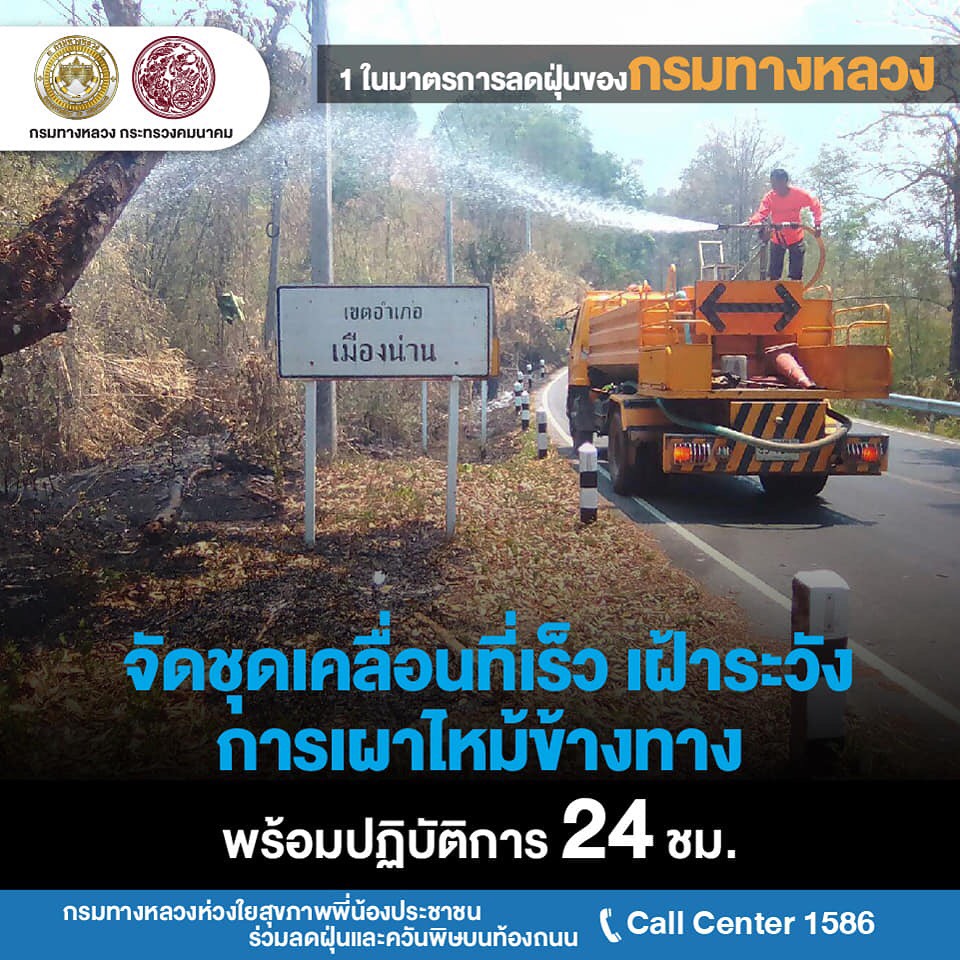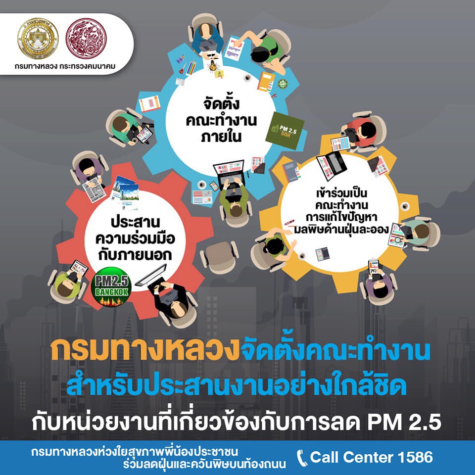 นายสราวุธ ทรงศิวิไล อธิบดีกรมทางหลวง (ทล.) เปิดเผยว่า สั่งการให้สำนักงานทางหลวงแขวงทางหลวง และหมวดทางหลวงทั่วประเทศ ดำเนินการตามแผนปฏิบัติการขับเคลื่อนวาระแห่งชาติของรัฐบาลในการแก้ไขปัญหามลพิษด้านฝุ่นละอองขนาดเล็ก หรือ PM 2.5 ด้วยการกำหนดมาตรการป้องกันแก้ไขปัญหาฝุ่นละอองใน 2 กรณี คือ กรณีที่ระดับปริมาณฝุ่น PM 2.5 มีค่าไม่เกิน 50 ไมโครกรัมต่อลูกบาศก์เมตร และกรณีเกิดสถานการณ์วิกฤตที่ระดับปริมาณฝุ่น PM 2.5 มีค่าเกิน 50 ไมโครกรัมต่อลูกบาศก์เมตรขึ้นไป กรณีที่ระดับปริมาณฝุ่น PM 2.5 มีค่าไม่เกิน 50 ไมโครกรัมต่อลูกบาศก์เมตร กรมทางหลวง จะดำเนินการมาตการ ดังนี้ ด้านงานก่อสร้างและบำรุงทาง มีการจำกัดพื้นที่หน้างานที่ก่อให้เกิดฝุ่นละอองให้น้อยที่สุดเท่าที่จำเป็น การเข้มงวดมาตรการป้องกันและลดฝุ่นละออง เช่น การปิดคลุมวัสดุก่อสร้างในการเก็บกองและ ขนย้าย การตรวจสอบสภาพเครื่องจักรก่อสร้างให้อยู่ในสภาพดี ห้ามใช้เครื่องจักรที่ก่อให้เกิดเขม่าควันดำ และการงดใช้น้ำมันเครื่องที่ใช้แล้วกับเครื่องจักรอุปกรณ์ เป็นต้น ส่วนขยะที่เกิดจากการก่อสร้างจะมีการจัดการอย่างเหมาะสม ห้ามเผาขยะโดยเด็ดขาด โดยพิจารณาวิธีการก่อสร้างที่ใช้การเผาไหม้เชื้อเพลิงน้อย เช่น warm mix asphalt การทำความสะอาด เศษฝุ่น เศษวัสดุที่สะสมบริเวณขอบทางและเกาะกลางอย่างสม่ำเสมอ รวมทั้งบูรณาการการทำงานร่วมกับจังหวัดทั่วประเทศในการลดการเกิดฝุ่นควัน และการอำนวยความสะดวกต่อการจราจรบนถนนบริเวณพื้นที่ก่อสร้าง เพื่อไม่ให้เกิดการจราจรติดขัดจากการก่อสร้างและบำรุงทาง ด้านงานการให้บริการผู้ใช้ทางและบริหารจัดการจราจรบนสายทาง จะประสานความร่วมมือระหว่างตำรวจทางหลวงและหน่วยงานที่เกี่ยวข้อง เช่น กรมควบคุมมลพิษในการตรวจจับรถยนต์ที่มีเขม่าควันดำ และเข้มงวดไม่ให้มีการจอดรถในพื้นที่ผิวถนนที่มีการจราจรแออัด จัดการจราจรให้ลื่นไหลลด การติดขัด รวมทั้งการบำรุงรักษาต้นไม้ริมทางหลวงให้อยู่ในสภาพดี เพื่อช่วยจับฝุ่นละอองจากถนน และเฝ้าระวังการเกิดปัญหาไฟป่าโดยการจัดชุดเคลื่อนที่เร็วพร้อมอุปกรณ์ในการป้องกันและควบคุม ด้านงานสำนักงาน ด้วยการลดการเดินทางของบุคลากร พิจารณาใช้เทคโนโลยีในการทำงานที่ช่วยลดการเดินทาง ลดการใช้ยานพาหนะส่วนตัว โดยเปลี่ยนการขนส่งสาธารณะโดยเฉพาะรถไฟฟ้า ตลอดจน การใช้รถยนต์ร่วมกัน (Carpool) สำหรับการเดินทางเส้นทางเดียวกัน นอกจากนั้นยังมีการจัดการขยะอย่างเหมาะสมโดยใช้วิธีการห้ามเผาโดยเด็ดขาด และรณรงค์ให้บุคลากรประหยัดพลังงานในสำ